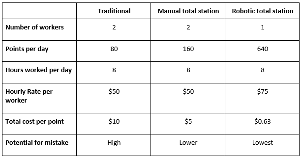 Mặt khác, chức năng Auto Stake phù hợp nhất cho các nhiệm vụ như lắp đặt móc treo và xuyên tường vì nó tự động quay chùm tia laze và hướng dẫn bạn đến điểm tiếp theo mà bạn cần thực hiện, loại bỏ nhu cầu quay lại thiết bị để hướng đến các điểm bố trí. Đối với quy trình xác minh và đo lưới tự động cho công trình hoàn thiện, bạn chỉ cần xác định khu vực và các trạm toàn đạc rô-bốt sẽ tự thực hiện tất cả các phép đo cho đến khi hoàn thành nhiệm vụ. So sánh dưới đây cho thấy mức tăng năng suất đáng kể, chuyển từ các phương pháp truyền thống sang máy toàn đạc thủ công và sau đó là máy rô-bốt.